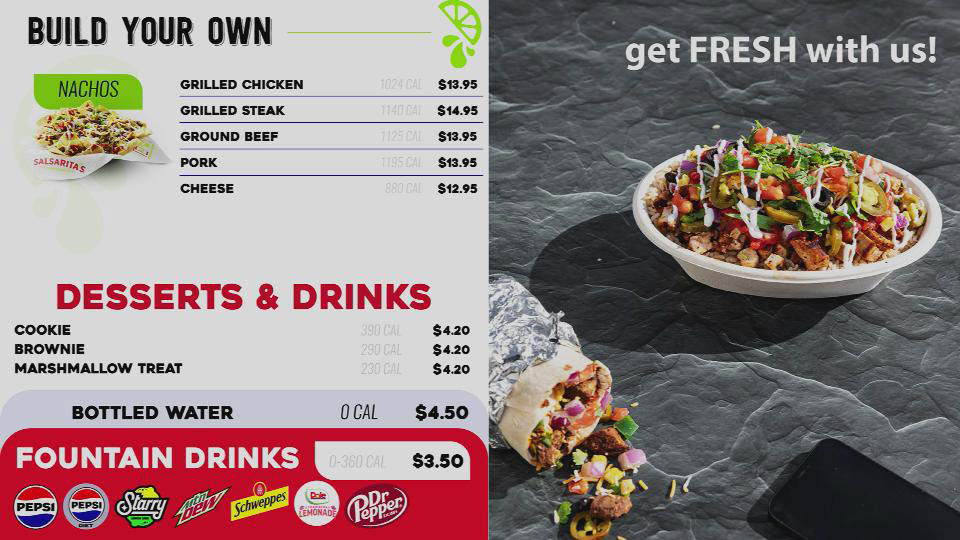 Get fresh with us! Serving specialty Mexican dishes including tacos, burritos, nachos, and burrito rice bowls.